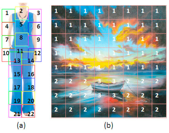 The images are segmented and labelled in accordance with the set . In example (a), the segmentation is performed using a grid, which divides the individual into parts of the human body and each part is labelled with the respective semantic concept. In the second example (b), the segmentation is obtained by dividing the whole image into a regular grid, where each cell of the grid is labelled with a semantic concept related to the painting (1 represents sky, 2 represents ocean, and 3 represents a boat).
