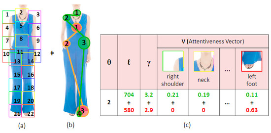 UFU-CLOTHING — the database is composed of 6946 clothing images collected from various Brazilian online shopping websites, 469,071 eye fixations and 73,414 ratings (of 1 to 5 stars) given by 245 users. The images are of human models posing in the same position, in order to facilitate the segmentation stage of the images into parts of the human body. In this article, a segmentation algorithm was developed based on the position of each part of the human body in the image, thus permitting the automatic segmentation of the images. In the interest of efficiency and based on the studies [22,23], the images were segmented into 22 parts of the human body (see Figure 2a), with 12 upper parts of the body, such as neck, right shoulder, left shoulder, etc., and 10 lower parts, such as right knee, left knee, etc.