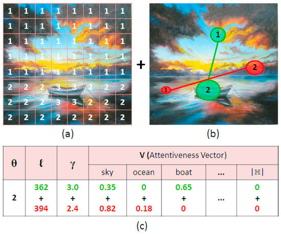 UFU-PAINTINGS—the database is composed of 605 images of paintings collected from the website pintura.aut.org, 444,780 eye fixations and 38,742 ratings (of 1 to 5 stars) given by 194 users. This database contains various paintings of diverse genres, produced between the XIV and XXI centuries. These can be divided into 9 categories, Animal, Architecture, Art, Abstract, Mythology, Still life, Nudism, Landscape, People, and Religion. In this article, we developed a software that divides the entire image into a grid of 20 × 20 parts of equal size. The user, by use of a mouse, labels each part with a semantic meaning. Through this, it was possible to manually label all the parts of the 605 paintings. The set , defined in Section 3, is composed of 41 labels of possible semantic meanings.