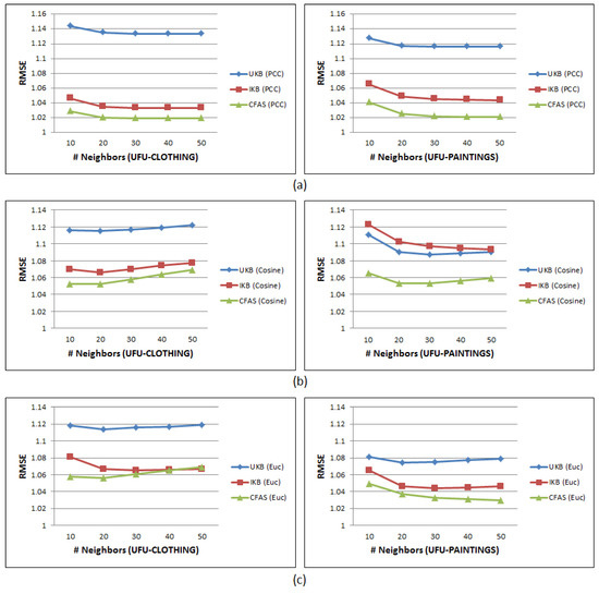 - Methods that use the neighbourhood parameter: The methods UKB, IKB, and CFAS use the neighbourhood parameter. The experiments are executed with a varying number of closest neighbours (k) of 10 to 50 and then the RMSE is computed for each method. These tests are conducted using three similarity measures based on ratings, Pearson Correlation Coefficient (PCC), cosine, and the inverted Euclidean distance (Euc). Figure 5 illustrates the obtained results in terms of RMSE in the database UFU-CLOTHING and UFU-PAINTINGS. It was noted that the similarity measure with the best results was the PCC and that the proposed method CFAS was superior in every case, with gains in relation to the UKB of 7.6% to 10%, and in relation to the IKB from 1.4% to 2.3%.