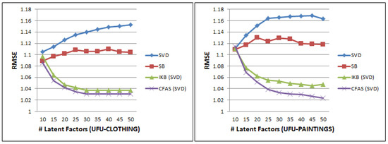 Figure 6. Evaluation of the best number of latent factors for the methods SVD, SVD + baseline (SB), IKB (SVD), and CFAS (SVD).