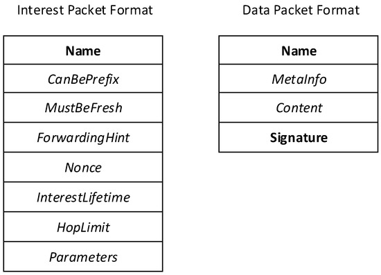 - NDN Packet Format Version 0.3. Available online: http://named-data.net/doc/NDN-packet-spec/current/intro.html (accessed on 27 September 2018).