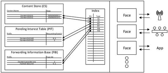 The architecture of a NDN node. It maintains a list of faces used for sending/forwarding and receiving packets and the tables such as an index, Content Store (CS), Pending Interest Table (PIT), Forwarding Information Base (FIB), and Routing Information Base (RIB) which is not shown in [6].