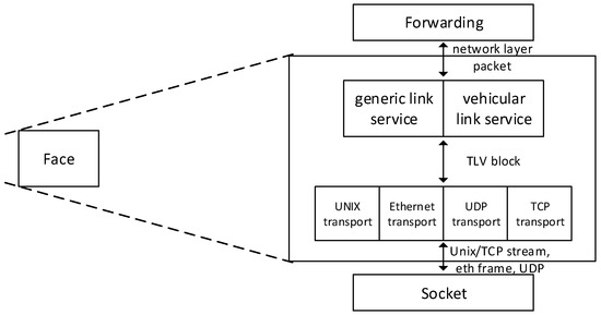 A Face is an abstraction of physical and virtual interfaces. In NDN, every entity that wants to communicate creates a Face. For instance, this can be physical interfaces, logical interfaces, and applications. Figure 3 depicts the architecture of an NDN Face. A Face consists of a link service and a transport mechanism. The link service is split into two types: generic and vehicular. Whereas the vehicular link service is currently neither implemented nor specified, the generic link service is available. As already mentioned, each Face can be an abstraction of a physical interface or a virtual or logical one. It supports different transport mechanisms, depending on the interface it hides. This level of abstraction allows NDN to be used as overlay network on existing networking technologies (e.g., IP).