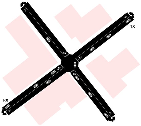 Scenario for the simulation campaign. Receiver (RX) and transmitter (TX) are approaching the middle of an intersection with other vehicles.