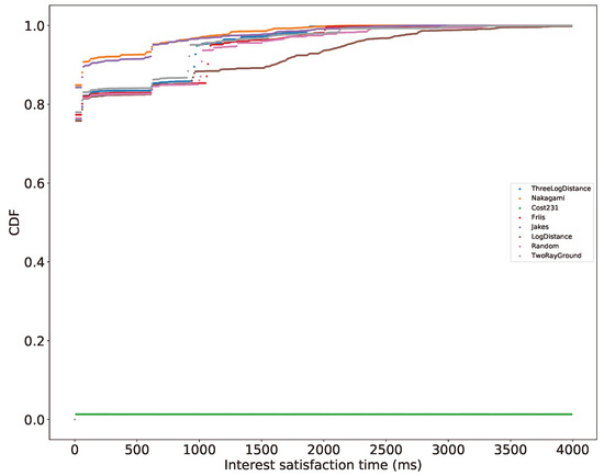 The results of this preliminary simulation campaign are summarized in Figure 6 and Figure 7. The satisfaction ratio (cf. Figure 6) already indicates that different models provide different results when applied to the same scenario. Even more insights are gained by investigation of the CDF of the delay of satisfied Interests (cf. Figure 7). The CDF of the delay indicates that the various propagation models lead to different results. The results especially differ when receiver and transmitter are far away of each other, such that the other vehicles are used as relaying units by the forwarding strategy (reflected by the satisfied Interests with higher delay). For instance with Nakagami fading we obtained the lowest satisfaction ratio but the best performance with respect to delay. Conversely, the satisfaction ratio with the LogDistance model was one of the highest but scores as one of the lowest when it comes to delay (such as the TwoRayGround model). Thus, a meaningful conclusion cannot be drawn from the simulation with respect to the performance of SAF in the used scenario. Thus, optimizing parameters of SAF (such as interval length/numbers of Interests defining an calculation interval or other parameters) does not pay off as each of the used models will lead to different parameters.