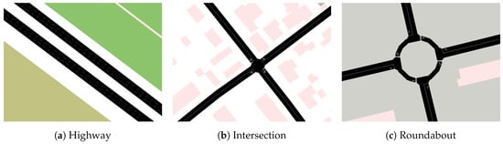 Street alignment. Additionally to highways and intersections, which are predominantly used street alignments in recent literature, we propose to simulate roundabouts, as traffic flow in roundabouts is fundamentally different to the intersection case. We found that SUMO currently does not correctly translate roundabouts, as they are interpreted as intersections. For an illustration of these basic street alignments, please refer to Figure 8. Please note that the number of lanes per direction is an additional variable of the simulation scenario. In addition to the literal street alignment, this dimension also defines the presence and position of classical traffic infrastructure, such as traffic lights or pedestrian crossings. At intersections, red traffic lights, and at pedestrian crossings, cars should share information for following cars, in order to optimize traffic flow and subsequently minimize travel time.