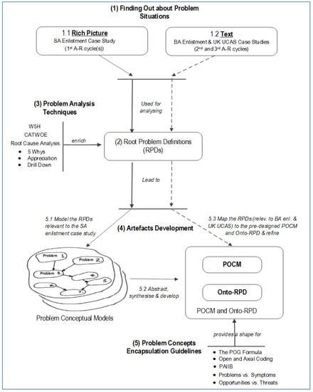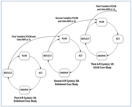The first A-R cycle was initiated by the analysis of the SA enlistment case study using the Checkland’s Soft Systems Methodology (SSM) [92] as an approach (i.e., research framework): (1) to capture the different worldviews of enterprise recruitment problem; (2) to develop the root problem definitions and the multiple entities (i.e., participating roles) in enterprise recruitment; and (3) to develop the first tentative POCM and Onto-RPD artefacts. The first version of the POCM and early outputs of this research were presented in previous publications of the authors [16,93]. Different problem analysis techniques such as Rich Pictures, CATWOE (Customers, Actors, Transformation process, Worldview, Owners and Environmental constraints), 5 Whys, and Cause-Effect analysis were used at this cycle. That version was later refined and supported by a corresponding Onto-RPD for more elaboration using text analysis from the other case studies. In the second A-R cycle, the BA enlistment case study was analysed using content/text analysis to capture the various root recruitment problem concepts. These resulting concepts were used to refine the first tentative POCM and Onto-RPD artefacts. The refined versions of POCM and Onto-RPD were presented in [94]. Similarly, the third A-R cycle was to analyse and extract the concepts from the UCAS case study to refine the second tentative POCM and Onto-RPD created in the second A-R cycle. To extract recruitment problem concepts during all A-R cycles, different problem analysis techniques and encapsulation guidelines were used. Figure 2 illustrates the incremental process of building the POCM and Onto-RPD.
