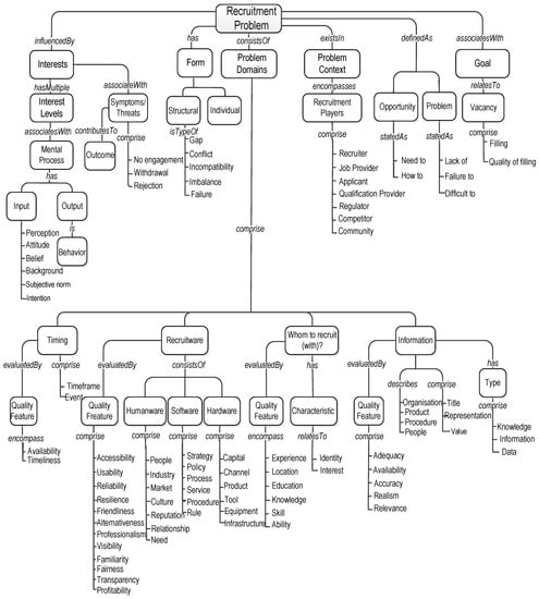 From the cognitive view, problems are conceptual entities that do not exist in the world, but they must be externalised (i.e., expressed), thus represented towards solution-oriented thought [24,57]. Problem representation enables problem domain knowledge, which is, in turn, crucially important in problem solving [21,23]. This task is very difficult for a real-world problem due to the various aspects that constitute it [22,25,27,67]. Hence, there is no reference model by which all these various aspects can be comprehensively represented [58,68]. Therefore, recruitment problem can be expressed by a chosen representation that is somehow grounded in reality; agreed on by all stakeholders; and best suited for problem solving [50,67]. Many criteria have been proposed for assessing the quality of such representation, such as validity and generativity [24,68]; abstraction [21,69]; viewpoints [69]; and expressiveness and communicativeness [68]. However, the quality varies based on many aspects of real-world problem such as the context and complexity of a real-world problem, the type of business, the type of project, and the feature of analysis [69,70,71].