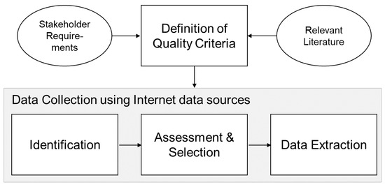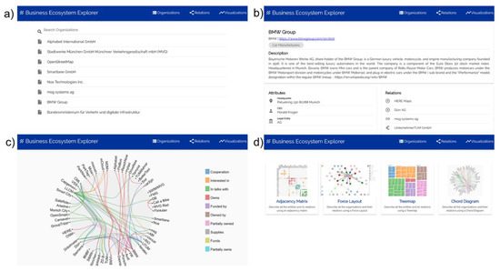 Starting from the publicly funded institution we had identified as main user and beneficiary of the ecosystem visualizations, we collected requirements from this stakeholder within two interviews. Additional quality measures were extracted from existing research [59,60,61,62]. For our initial data collection, the identified Internet sources were evaluated using the following criteria: (a) data access—we focused on openly available Internet data sources; (b) platform focus—the data source should at least contain data that is relevant for a mobility business ecosystem within the scope of the smart city project; (c) geographic focus—the content of the source should contain data that is relevant for the local mobility ecosystem; (d) data scope—defining what kind of data is covered regarding (d1) entities—with attributes such as name, legal type, headquarter, CEO, description, and (d2) relations—with attributes such as type of relation, involved partners, date (in case of a funding); (e) data extraction—how easy can the relevant data be extracted from the source, and (f) data validity—can the source be trusted. All identified Internet data sources we also referred to later on provided information in either English or the local native language (in our case: German). Thus, an assessment based on the language was not conducted.