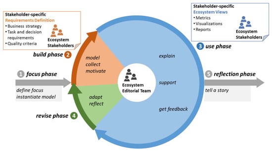 The next three phases of the process are iteratively executed. The build phase (2) comprises activities to motivate creation and use of the VAS, to collect data about/from the ecosystem, and to carry out the modeling. Basic requirements for engaging in an ecosystem modeling initiative stem from the core stakeholders such as the executive management, strategy boards, business case owners or project teams of enterprises, entrepreneurs, representatives of public authorities, institutions, or organizations, or other domain exerts. Together with these experts, specific questions about the ecosystem, its development or structures are formulated as basis of a stakeholder-specific requirements definition. These questions mirror the business or policy strategies that undergird the respective intentions and initiatives at large as well as specific task and decision requirements. They also lead to quality criteria that guide the further modeling process (see also Section 4.1) (for reasons of simplicity, we further apply the use scenario of an enterprise, but roles will correspond to use in a public policy maker scenario, too). These requirements are taken up by a team (role) we named the Ecosystem Editorial Team. This role is responsible for collecting data and executing the modeling (it is conceivable that for public use, a separate, public or third party funded editorial office is created that overlooks and eventually investigates on ecosystem data sources).