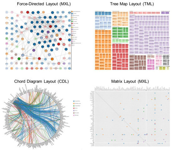 These layouts include force-directed layout (FDL), tree map layout (TML), matrix layout (MXL), radial network/chord diagram (RCD), and modified ego-network layout (MEL). Interactive features, such as clicking, dragging, hovering, and filtering, are essential parts of the visualizations. These layouts are used by us as the baseline for the design of our own VAS in our problem context. Nonetheless, further designs exist, such as bi-centric diagrams that visualize the relative positioning of two focal firms [20,23] or cumulative network visualizations [19].
