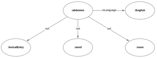 In a 2009 TED talk, Tim Berners-Lee said that by creating relationships in data, “the more things you have to connect together, the more powerful it is”; to create these relationships, he recommends putting data on the web and using Uniform Resource Identifiers (URIs), where the URI is the same as an IRI, except the former only allows for ASCII characters [9,10]. In the context of this paper, URIs are used. URIs differ from Uniform Resource Locators (URLs) conceptually, where the latter refers to the location of a document, but the former serves to identify: not only documents, but objects or concepts as well [11], [12] (p. 25), [13] (p. 46). Returning to the short statements serialised in Turtle, the “:English” object can be replaced with a URI from an external resource, for which Lexvo.org has been selected. Another triple has been added, where the denotation of the lexical entry Abdomen is identified as the DBpedia resource “Abdomen”. The triples are now as follows: