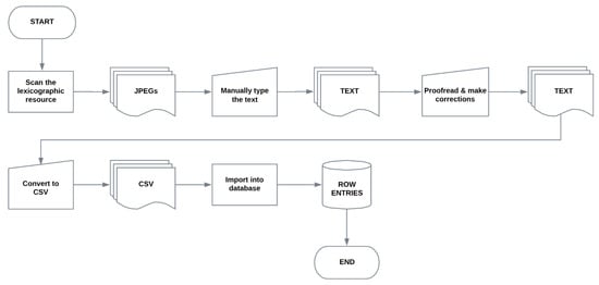 Digitisation of the resource was attempted using a high-resolution scanner and optical character recognition (OCR) in Adobe Acrobat Pro. However, the text could not be recognised, and as a result, the resource was manually typed. 1748 lexical entries were imported into the database, and at least 200 of those entries were estimated to be translation equivalents due to the restricted treatment of the lemma sign, for which the “source language item, represented by the lemma sign, is co-ordinated with a single target language item” [19] (p. 154). Some lexical entries, although outdated, will be published and indicated as such; an example is the lexical entry with the lemma Sanatorium. However, lexical entries which no longer have relevance, for example, the article Benger’s Food, a medicinal tinned food produced until the middle of the 20th century, have been excluded from publication [20,21].