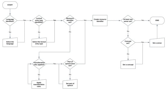 A Dictionary Writing System (DWS) was developed by the author, using PHP as the web scripting language and a MySQL database. The purpose of the DWS is to manage the languages, lexical entries, and lexical concepts of the project; to prepare the lexical entries, lexical concepts, and the lexicons for publication; and to generate the different formats required: RDF serialised using Turtle and N-Triples. The publishing process of a single lexical entry is illustrated in Figure 4.