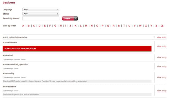 Each lexical entry must have at least one sense, and once a sense has been set, the lexical entry is automatically published the following day, this includes lexical concepts (published either as a new concept or as an existing concept updated to include the lexicalised sense of the lexical entry), and the lexicon (as an update, showing the lexical entry as a new member of the lexicon). Figure 5 shows a selection of lexical entries in the DWS for the article stretch A, with en-n-abdomen scheduled for (re)publication.