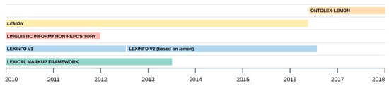 - McCrae, J.; Spohr, D.; Cimiano, P. Linking lexical resources and ontologies on the semantic web with lemon. In The Semantic Web: Research and Applications; Antoniou, G., Grobelnik, M., Simperl, E., Parsia, B., Plexousakis, D., De Leenheer, P., Pan, J., Eds.; Springer: Berlin/Heidelberg, Germany, 2011; pp. 245–259. [Google Scholar]