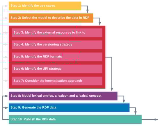 In 2015, Gracia and Vila-Suero published guidelines for generating Linguistic Linked Data for multilingual dictionaries and other lexical resources, and they are broadly described here: (1) identify the model, (2) select the vocabularies, (3) analyse the data source(s), (4) model the source lexicon, the target lexicon, and the translation set, (5) model a lexical entry, (6) design the URIs, (7) transform the data into RDF, (8) publish the RDF dataset, and (9) publish the metadata [24].