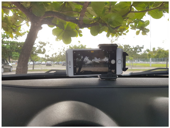 To overcome the smartphone support issue and to meet the requirements specified previously, we designed a stable device support using a two-sided tape and part of a windshield suction cup support. We remove the support portion that holds the device from the cable with a suction cup that is attached to the windshield. Then, we fixed the first part centralized at the vehicle panel with the two-sided tape. This design allows the device to capture the traffic scene without a bias to the left or to the right. The proposed layout forces the device to use the camera in landscape mode, reducing the portion of sky captured and maximizing the traffic scene size obtained (Figure 1).