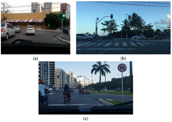 Three different smartphones were used to capture traffic videos containing traffic lights: a Motorola G second generation (Motorola Mobility LLC, Chaoyang District, China), an iPhone 6 (Foxconn CMMSG Indústria de Eletrônicos LTDA, Jundiaí-SP, Brazil), and a Galaxy S8+ (Samsung Eletrônica da Amazônia LTDA., Manaus-AM, Brazil). All devices were configured to capture video with HD resolution. Figure 2 shows an example of images obtained with these devices. The images were extracted from videos at 5 frames per second (fps) rate.
