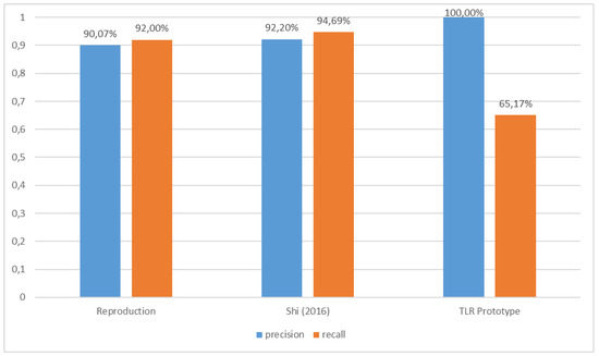 Precision and recall rates on our reproduction of [2], original work from [2], and tests using the images obtained with the TLR device prototype, respectively.