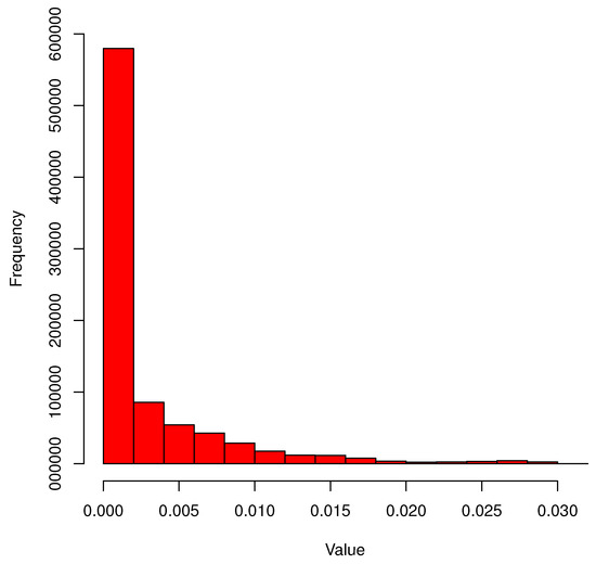In Figure 7, we observe the frequency distribution histogram of the map shown in Figure 6. The x-axis represents the previously calculated traffic light frequency values, and the y-axis represents the frequency of those values. The parameters of the beta distribution found for the map of Figure 6 were .
