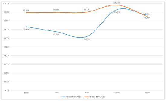 In Figure 8, we can observe the accuracy rates obtained by successive tests. We can notice that the training with EK (orange line) using 1000, 4000 and 7000 samples increased in at least the accuracy rate in comparison with the training without EK (blue line).