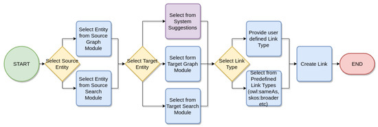 The platform enables the collaborative creation and validation of linksets, as multiple users can work on the same project simultaneously and interactively. The users can provide a positive or negative vote or comment on a particular link between two entities, thus validating the linksets. A typical workflow is presented in Figure 1.