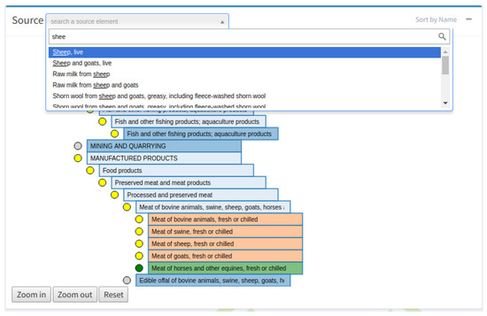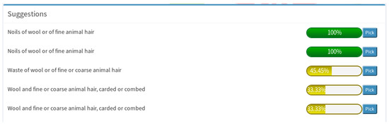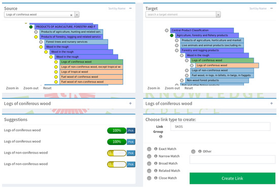 Below the descriptions section, there is a panel with the similarity scores; these are calculated as described in Section 3.3. On the selection of a source element, the module retrieves the matched entities from the scores graph, if any, and displays them to the user. The scores are presented in score descending order, and a button on the right side of the score of each entity selects the related target entity on the graph, and presents its description in the target infobox section. If no suggested target entity is found or the user decides that none of the proposed entities are related to the selected source element, the user can utilize the Target Graph module to select a target entity. In Figure 6 we see a snapshot of the System Suggestions Module. The user has selected an entity from the source graph with the label “Noils of wool or of fine animal hair”. The system has found six candidate entities (five are shown here) from the target graph based on the similarity configuration of the project.
