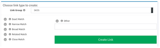 On the Semantic Web, different type of links express different semantics between entities. For example, two entities may represent the same concept so they could be linked via a skos:exactMatch, or owl:sameAs link, or concept A could be a broader match of concept B, so it could be connected via skos:broadMatch. The user should be able to choose the link type.