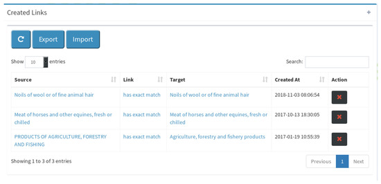 On the last panel of the GUI, presented in Figure 8, the user can monitor the links created on the project, which are presented on a searchable and orderable table. The user can delete created linksby clicking on the “X” button and export them into different RDF serializations. The user may also import links in various RDF serializations, that may have been produced by other automated or manual matching tools.