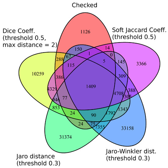 - Jaro, M.A. Advances in Record-Linkage Methodology as Applied to Matching the 1985 Census of Tampa, Florida. J. Am. Stat. Assoc. 1989, 84, 414–420. [Google Scholar] [CrossRef]