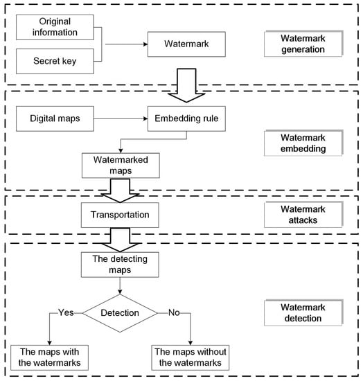 - Sun, J.G.; Men, C.G.; Zhang, G.Y. Static dual watermarking of vector maps to anti-interpretation attacks. J. Harbin Eng. Univ. 2010, 31, 488–495. [Google Scholar] [CrossRef]