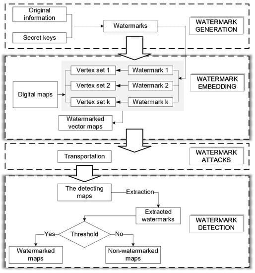 - Wang, Y.; Yang, C.; Zhu, C.; Ren, N.; Chen, P. A novel multiple watermarking algorithm based on correlation detection for vector geographic data. Proceedings of 4th International Conference on Geo-Informatics in Resource Management and Sustainable Ecosystem, Hong Kong, China, 18 November 2016; Springer: Singapore, 2017. [Google Scholar]