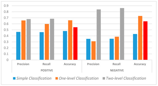 Such an approach allowed to increase the recall and precision indicators in average to 78% and guarantee the accuracy level at about 75%. These indicators unfortunately do not exceed the indicators presented in the works [21,22,23,24,25,30,31] (Hypothesis 2 is partly accepted). This fact can be explained by the reason of the chosen language and its methodology quality verification and lack of any available basic tools as well as a publicly available list of words (vocabulary) with established polarities.