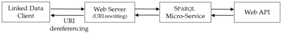SPARQL micro-services can be used to implement URI dereferencing in a straightforward manner. Once a domain name and URI scheme are chosen, a Web server can be set up to deal with this URI scheme. When the Web server receives a look-up query for a URI that matches the scheme, it generates an invocation of the relevant SPARQL micro-service. Technically, the Web server acts as a reverse proxy: It queries the SPARQL micro-service and transparently proxies the response back to the client. Figure 2 sketches this architecture.