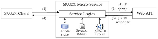A SPARQL micro-service evaluates a query against an RDF graph built at run-time from data obtained from the Web API. The steps involved in this evaluation are depicted in Figure 4, and we describe them further on in Algorithm 1 (the algorithm’s step numbers match those in Figure 1).