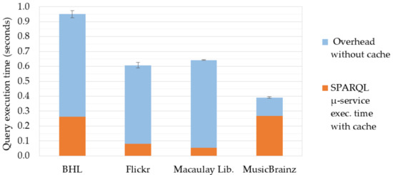 The evaluation of by Corese-KGRAM took an average 3.66 s without using the cache database, while the four individual invocations sum up to 2.59 s (2nd column of Table 2). Similarly, the evaluation took an average 1.68 s when using the cache while the individual invocations sum up to 1.16 s (3rd column in Table 2). The overhead of 1.07 s and 0.52 s respectively can be attributed to the query processing by Corese-KGRAM’s SPARQL engine as well as networks overheads. The log also revealed that the SERVICE clauses are evaluated sequentially, although they could be evaluated in parallel since they are independent from each other. We discussed this question with the developers who confirmed that, as of today, Corese-KGRAM does not support parallel evaluation of independent SERVICE clauses.