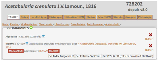 Detecting this disagreement can be achieved easily using SPARQL query in Listing 9. The query searches solutions where Acetabularia crenulata would have status accepted in TAXREF and a different status in WoRMS. If returns a non-empty solution set, then both sources disagree and the solution provides the reference name according to WoRMS. In turn, the Web application must point out this disagreement and provide the user with a way to accept or dismiss this change. Figure 8 depicts an extract of TAXREF-Web’s edition page where this option is denoted by the red button “MAJ REF” (update reference name). A similar SPARQL query (not shown here) can detect a disagreement with respect to the author’s name spelling, “J.V.Lamour.” in TAXREF and “J.V.Lamouroux” in WoRMS. The red button “MAJ AUTEUR” (update author) allows to acknowledge this change in TAXREF.
