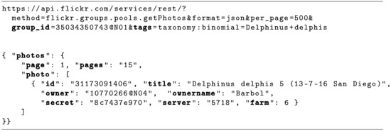 Top: Invocation of a Flickr’s Web API service (technical parameters were left over for clarity). Bottom: Snippet of the JSON response.