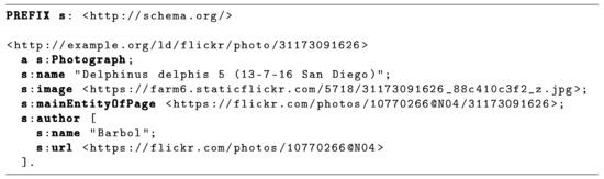 - Beckett, D.; Berners-Lee, T.; Prud’hommeaux, E.; Carothers, G. RDF 1.1 Turtle: Terse RDF Triple Language. W3C Recommendation. 2014. Available online: https://www.w3.org/TR/2014/REC-turtle-20140225/ (accessed on 5 December 2018).