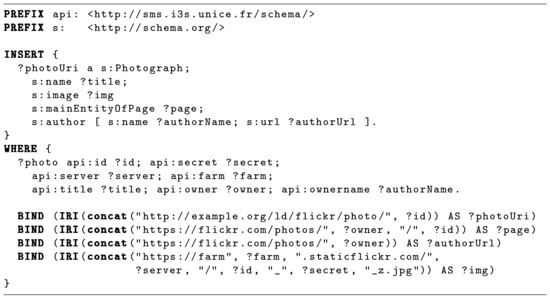 The resulting graph G is stored into the local triple store. It consists of various proprietary and somehow technical predicates. For instance, the servers and farms identifiers are of little interest for a Linked Data representation, but the API documentation describes how to reconstruct the URLs of photos and users pages from these fields. This however involves the concatenation of several fields, that JSON-LD is typically incapable of describing. Therefore, the micro-service provides an INSERT query shown in Listing 3, that augments G with triples based on the Schema.org vocabulary. Listing 4 shows the graph obtained after completing both steps. The two blank nodes correspond to the application of the JSON-LD profile, while the other triples result of executing the INSERT query.