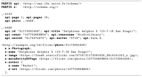 To illustrate this algorithm, we follow up on the example introduced in Section 3.1. Steps 1 and 2 are as exemplified in Listing 1. In step 3, let us assume that the getPhotosByGroupByTag micro-service provides the JSON-LD profile below, that turns each JSON field name into an ad hoc RDF predicate within name space “http://sms.i3s.unice.fr/schema/” (note that any arbitrary complex profile may be used at this point):
