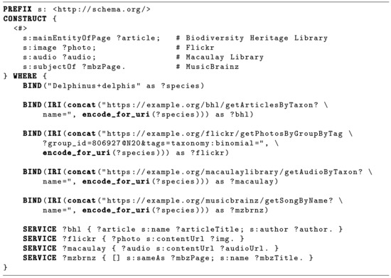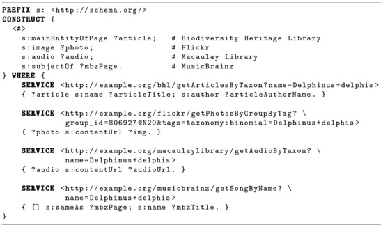 Let us assume a client wants to retrieve the URLs of photos of dolphins, posted to the Encyclopedia of Life Images group (https://www.flickr.com/groups/806927@N20) wherein photos are tagged with the species scientific name formatted as “taxonomy:binomial=<scientific name>”. To do so, the client executes the SPARQL query below against any SPARQL 1.1 endpoint, in which the SERVICE clause invokeswhile passing the group_id and tags arguments: