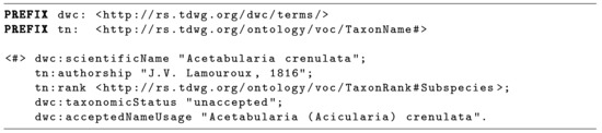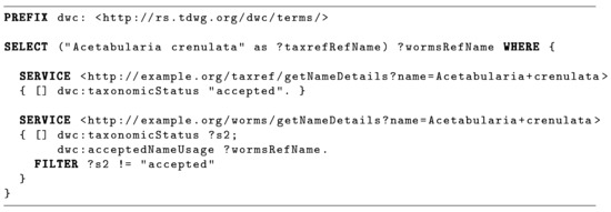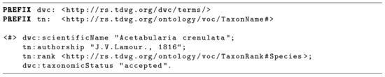 We now illustrate the use case sketched above in the context of a synonymy disagreement, exemplified in the case of taxon Acetabularia crenulata. Let us assume that we have defined SPARQL micro-services for TAXREF and WoRMS Web APIs (TAXREF’s Web API allows querying TAXREF’s database; it is exploited by the TAXREF-Web application), whose invocations produce the graphs depicted in Listing 7 and Listing 8 respectively. According to TAXREF, Acetabularia crenulata is a reference (or “accepted”) name, whereas according to WoRMS, it is a synonym name and the reference name should be Acetabularia (Acicularia) crenulata instead.