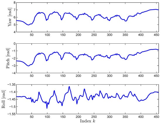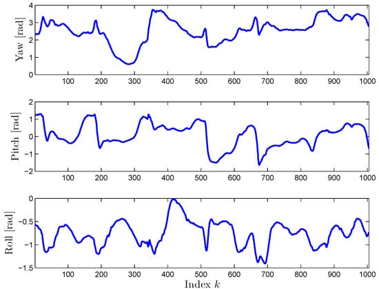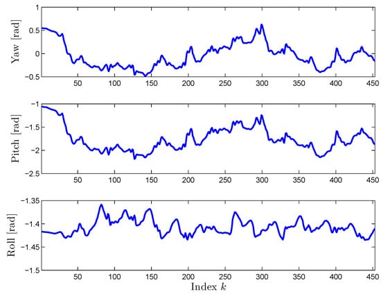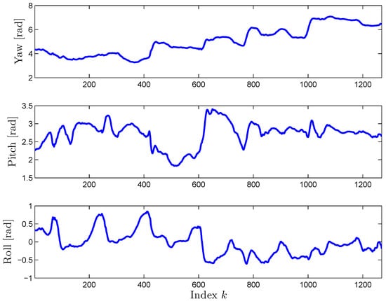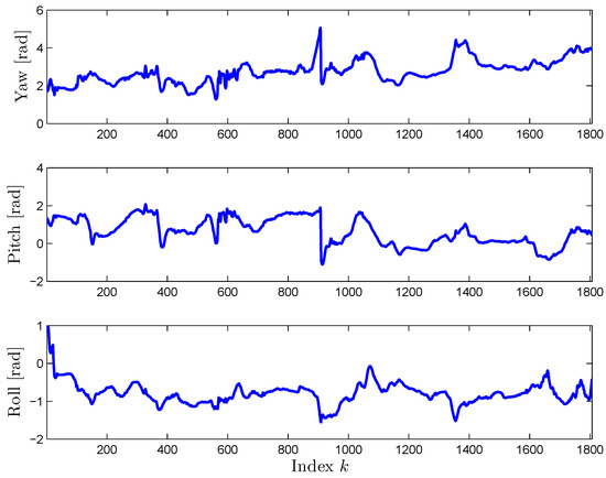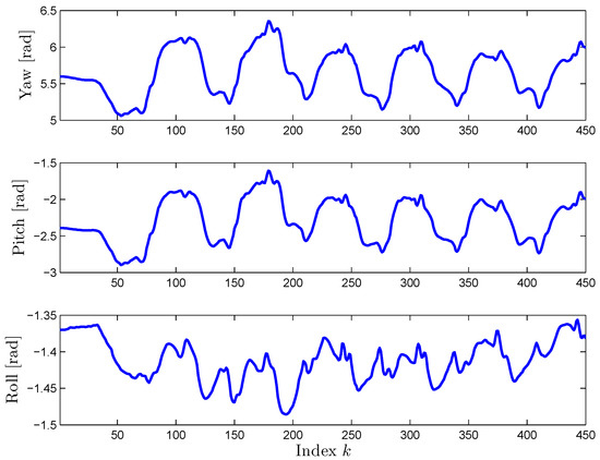 A further auxiliary Matlab® script converts the yaw, pitch and roll angles triples to a gyroscopic signal , whose elements are rotation matrices, that represents the instantaneous orientation of the smartphone with respect to a fixed reference frame (typically defined on the basis of a magnetoscopic sensor). The obtained gyroscopic signal will be converted back to angular speeds as explained in the next section. The intermediate rotation data are introduced in order to make the procedure independent of the type of acquired data, since different gyroscopic mobile applications might acquire different kinds of angles. (The proper Euler angles triples and the Tait–Bryan angles triples amount to twelve possible combinations [26].)