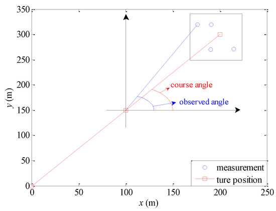 wheredenotes theth observed angle, anddenotes the course angle for the target, as shown in Figure 2, which can be calculated by Equations (7) and (8). In addition, is the number of observed angles, and is the given association gate.