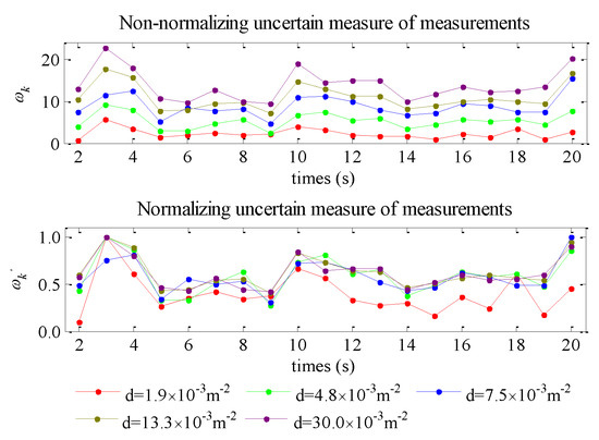 where and denotes the predicted measurement and the number of measurements, respectively while is the given association gate. In Equation (1), describes the clustering feature of measurements at time , and describes the distribution of statistical probabilities assigned to the measurements. For easy calculation in the following section, one can normalize the uncertain measure by , where is the maximum value for all observed times.