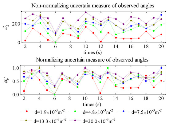 As shown in Figure 3, both the non-normalizing and normalizing uncertain measure values increase with an increasing clutter density according to their corresponding variation curves, although the increasing rate of the latter becomes relatively weaker because of normalization. Moreover, the uncertain measure value can vary with the clutter density at different times. Similarly to the uncertain measure of measurements, the non-normalizing and the normalizing uncertain measure values of observed angles both present the same change trend of the clutter density. Hence, we can utilize the uncertain measures of measurements and observed angles to describe their uncertainty accurately.