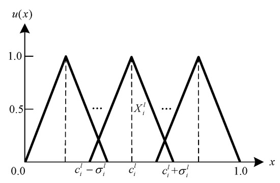 where is an unit matrix while and are assumed to be the fuzzy set and the membership function for , respectively. Here, , and adopt a triangular function given by Equation (28), as shown Figure 5.